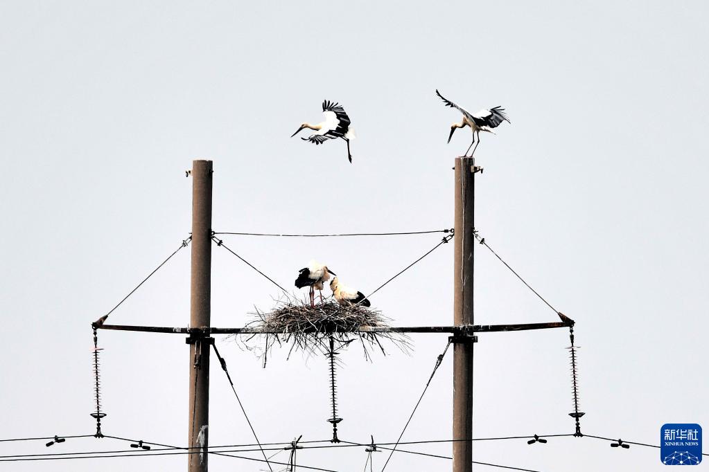 這是山東黃河三角洲國(guó)家級(jí)自然保護(hù)區(qū)電線桿上的東方白鸛的巢(2021年5月13日攝)。新華社記者郭緒雷攝