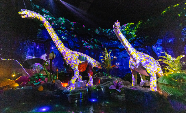 在大型室內(nèi)河道漂流項(xiàng)目《河谷探秘》中,游客乘坐漂流船緩緩駛?cè)肟铸埡庸龋┰狡俨剂魉?、植被茂密的雨林秘境,近距離接觸眾多恐龍和原始生物族群。神秘的河谷氛圍,有趣的恐龍互動(dòng),引發(fā)現(xiàn)場(chǎng)游客陣陣驚呼。