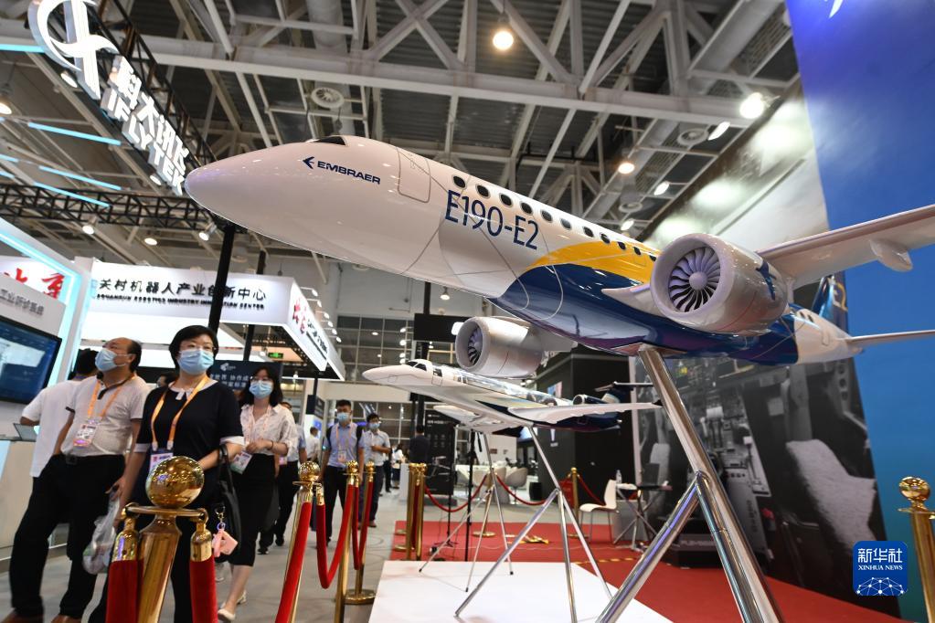 參觀者從2021金磚國家新工業(yè)革命展展出的飛機(jī)模型前走過(2021年9月8日攝)。新華社記者 林善傳 攝