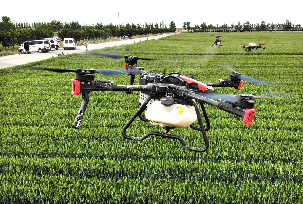 裝機(jī)、灌藥、起飛,幾架直徑一米左右的無人機(jī)在技術(shù)人員操控下盤旋爬升、空中懸停、勻速前行,霧化藥肥混合劑均勻地灑在麥苗上,僅用1分鐘就完成了1畝農(nóng)田的植保任務(wù)。