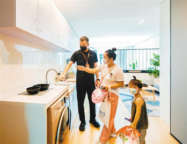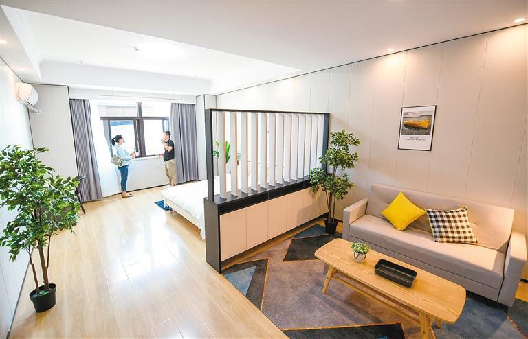 簡(jiǎn)單介紹后,工作人員帶著劉女士參觀了位于6樓的樣板間。“真寬敞夠亮堂!”房門打開(kāi)的一瞬間,劉女士忍不住感嘆道。這套房源有70多平方米,裝修簡(jiǎn)約時(shí)尚、充滿年輕氣息,洗衣機(jī)、冰箱、空調(diào)等設(shè)施一應(yīng)俱全,家具陳列干凈整潔。“真沒(méi)想到條件這么好,房間內(nèi)的裝修和家具都是我喜歡的樣子。尤其是房間里有獨(dú)立的衛(wèi)浴,住起來(lái)會(huì)很方便。”劉女士說(shuō),自己對(duì)房源很滿意。參觀結(jié)束后,劉女士立即向工作人員詳細(xì)詢問(wèn)租住流程。