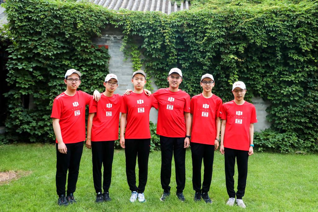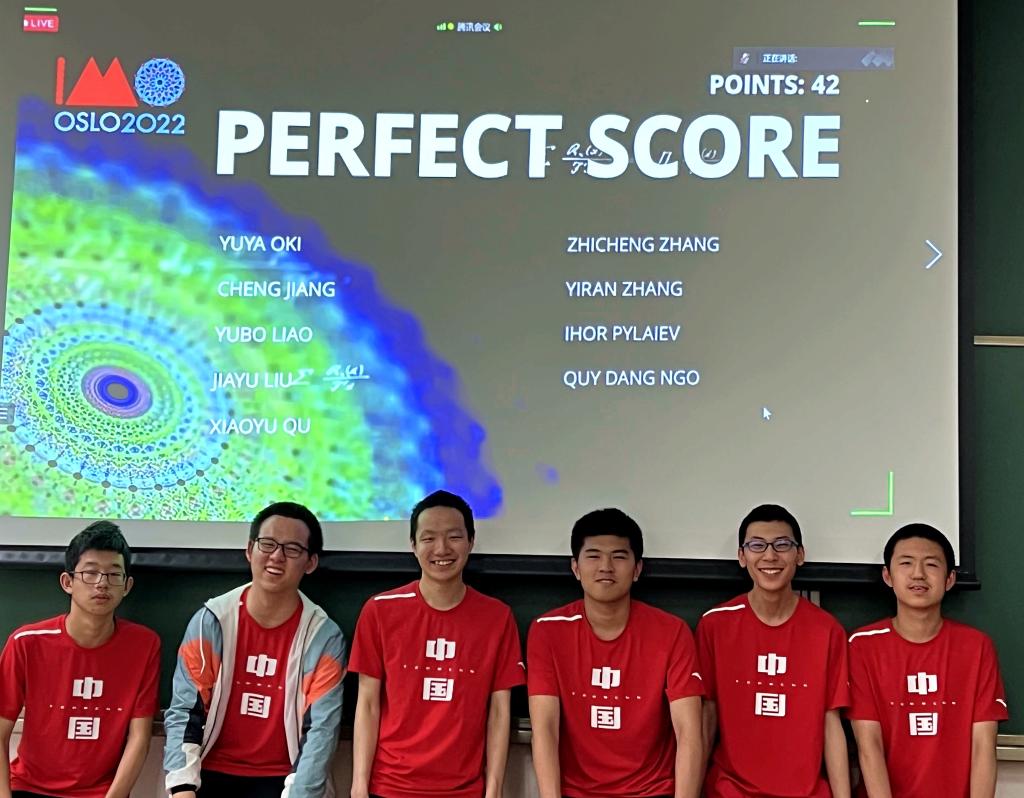 圖為中國數(shù)學(xué)奧林匹克國家隊(duì)6名隊(duì)員在成績屏前合影。