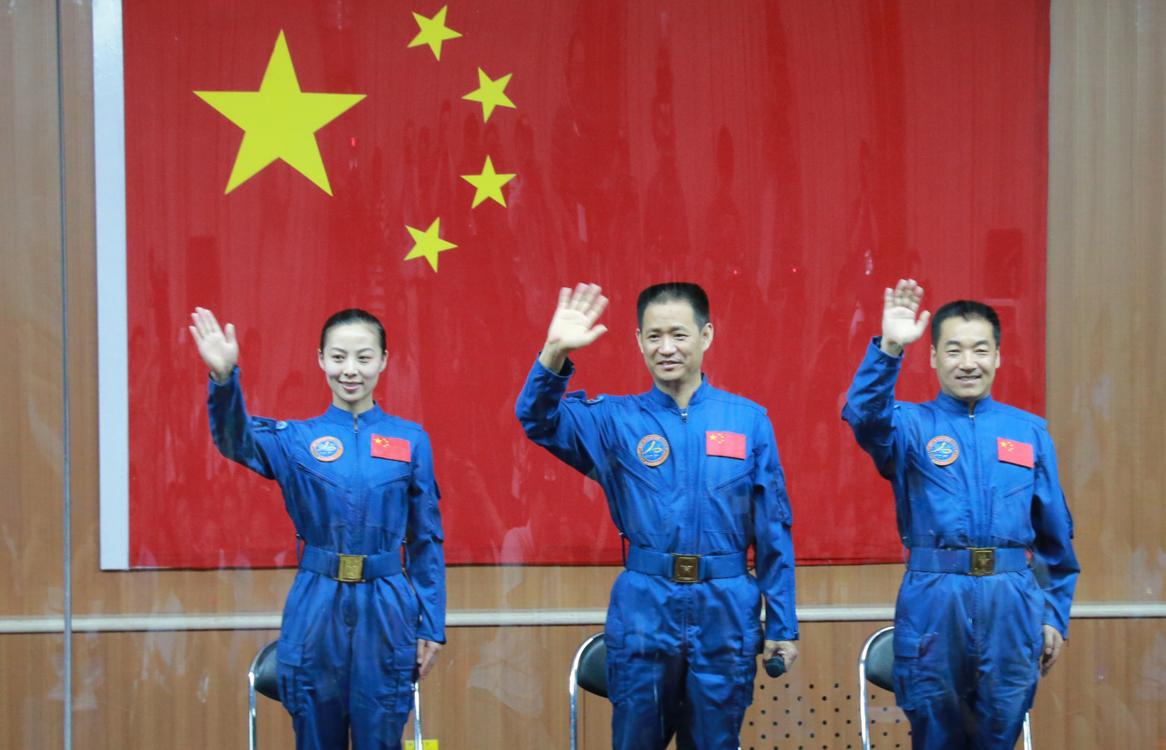 2013年6月10日,天宮一號(hào)與神舟十號(hào)載人飛行任務(wù)航天員在酒泉衛(wèi)星發(fā)射中心同記者見面。新華社記者 李剛 攝