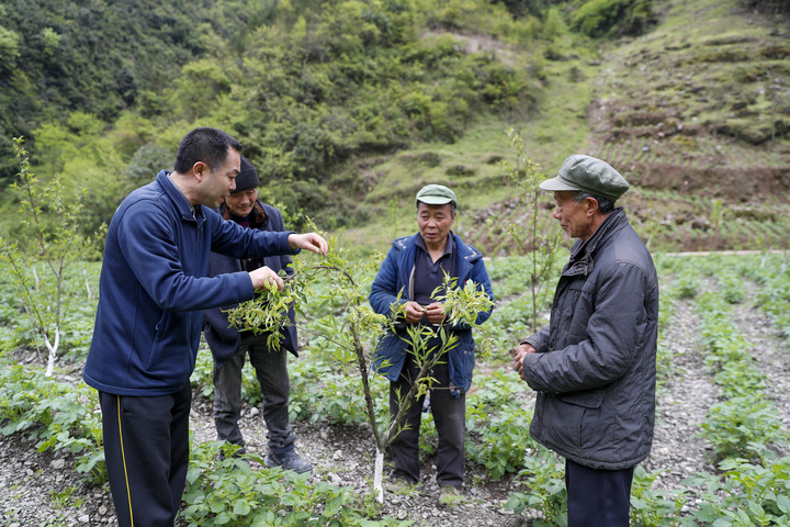 在重慶市巫溪縣天元鄉(xiāng)萬(wàn)春村,專(zhuān)家團(tuán)隊(duì)成員王大平(左一)對(duì)村民進(jìn)行冬桃樹(shù)苗整形壓枝培訓(xùn)(2020年4月23日攝)。新華社記者 黃偉 攝