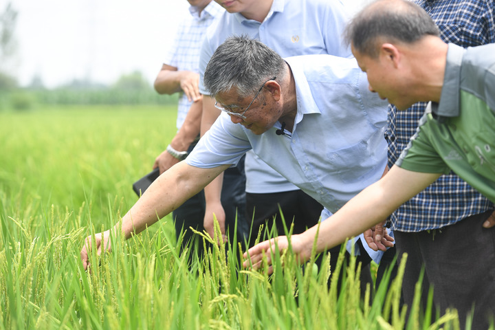在江蘇省句容市天王鎮(zhèn)戴莊村,農(nóng)業(yè)專(zhuān)家趙亞夫(中)帶著團(tuán)隊(duì)成員查看有機(jī)水稻長(zhǎng)勢(shì)(2021年7月6日攝)。新華社記者 季春鵬 攝