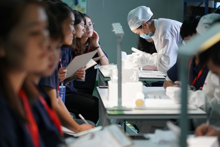 在西安市2019年高技能人才技能大賽暨新能源新材料技能競(jìng)賽決賽上,參賽選手(右)現(xiàn)場(chǎng)查看硅片的外觀(2019年9月5日攝)。新華社記者 邵瑞 攝