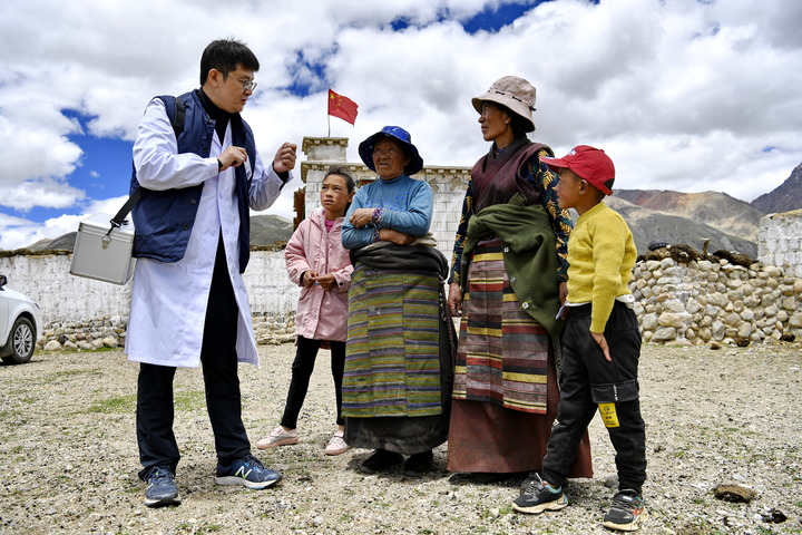 在西藏拉薩市當(dāng)雄縣格達(dá)鄉(xiāng)格達(dá)村,第六批醫(yī)療人才“組團(tuán)式”援藏專(zhuān)家王克明(左一)為村民講解健康知識(shí)(2021年6月19日攝)。新華社記者 張汝鋒 攝
