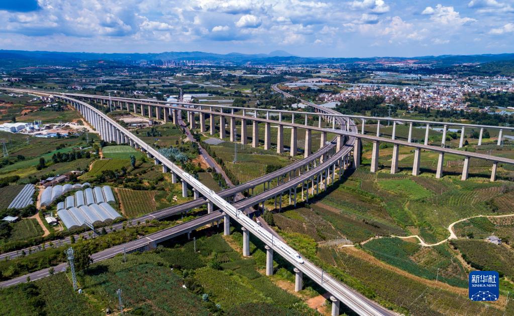 8月23日,綜合檢測(cè)車(chē)在彌蒙高鐵彌勒站附近上行線行駛,遠(yuǎn)處是下行線,中間橫向鐵路是南寧至昆明客運(yùn)專(zhuān)線,下穿高速是瀘彌高速(無(wú)人機(jī)照片)。新華社記者 陳欣波 攝