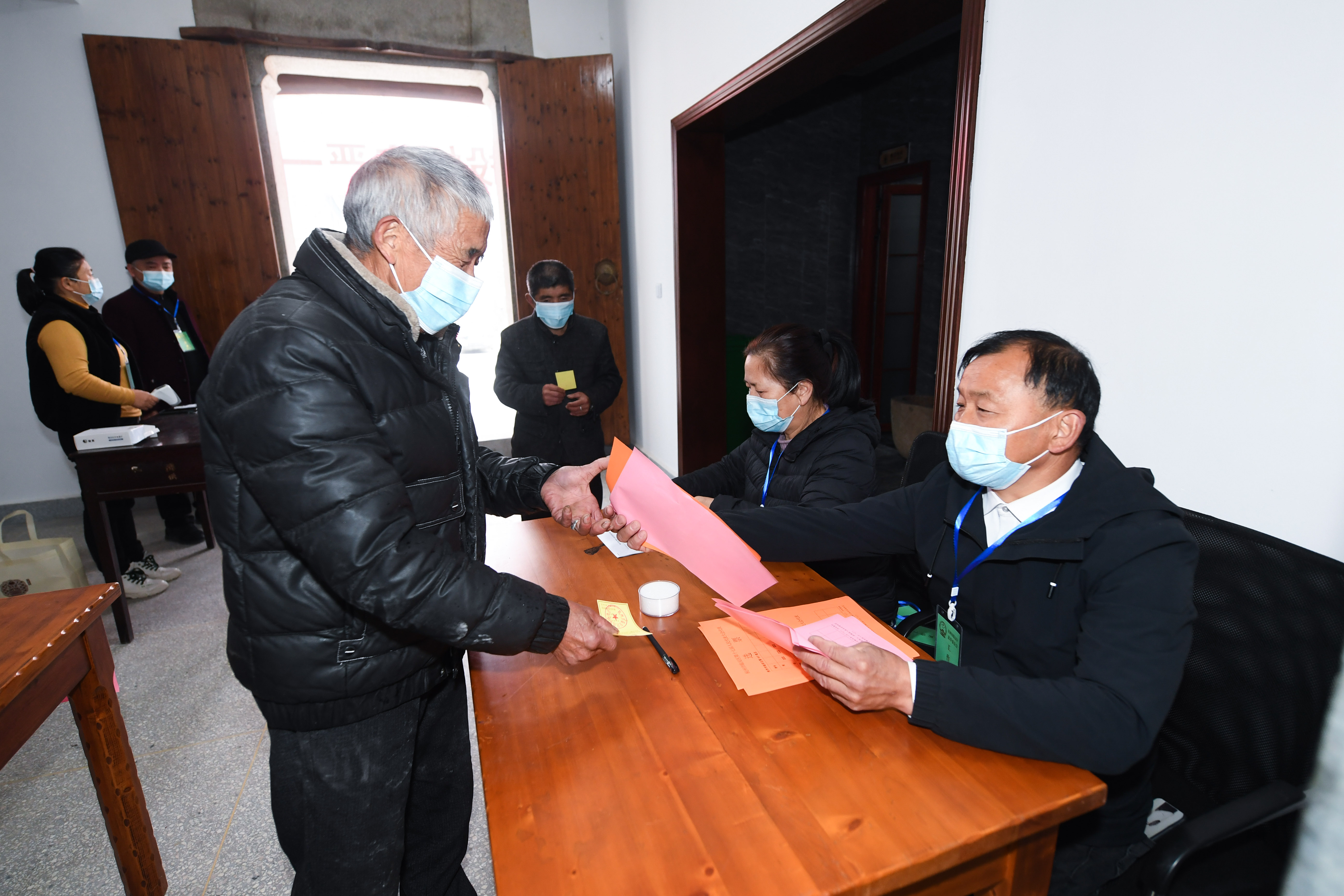 村民在浙江省杭州市臨安區(qū)湍口鎮(zhèn)迎豐村的基層投票點(diǎn)領(lǐng)取選票參加基層人大換屆選舉投票(2021年12月14日攝)。新華社記者 徐昱 攝
