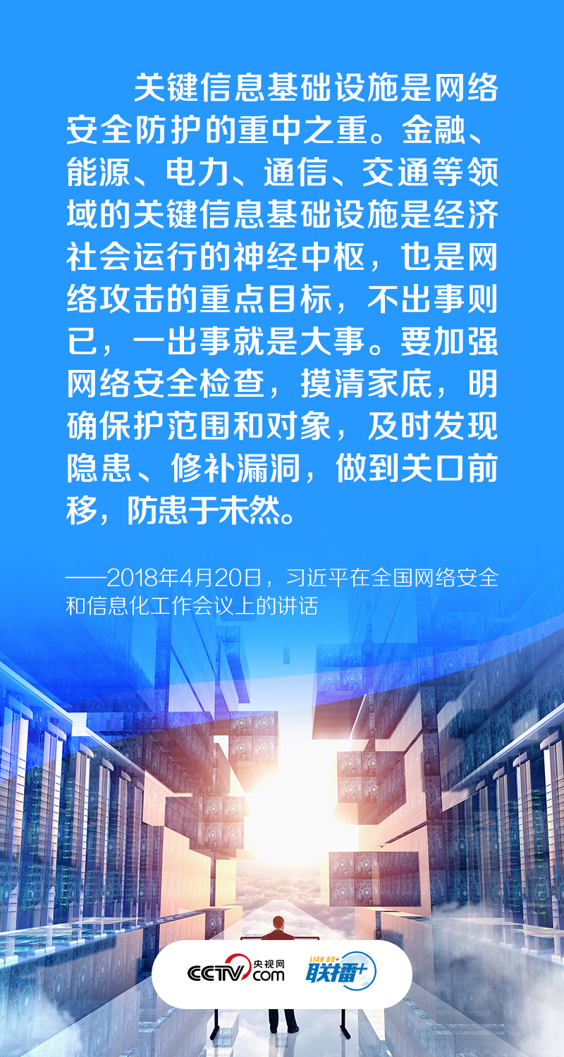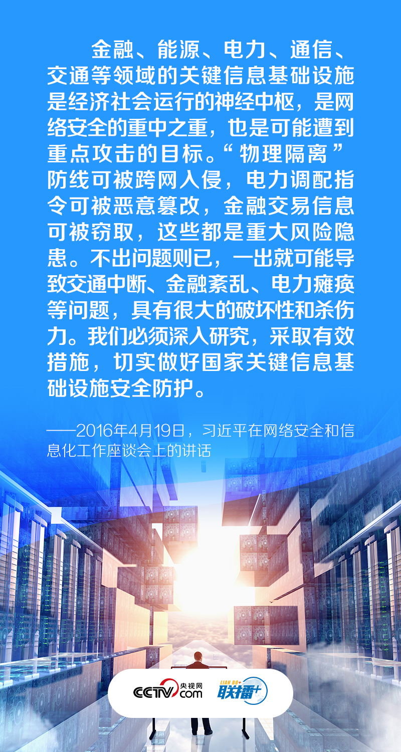 聯(lián)播+“金融、能源、電力、通信、交通等領(lǐng)域的關(guān)鍵信息基礎(chǔ)設(shè)施是經(jīng)濟(jì)社會(huì)運(yùn)行的神經(jīng)中樞,是網(wǎng)絡(luò)安全的重中之重,也是可能遭到重點(diǎn)攻擊的目標(biāo)。”習(xí)近平總書記強(qiáng)調(diào),關(guān)鍵信息基礎(chǔ)設(shè)施是網(wǎng)絡(luò)安全防護(hù)的重中之重,“我們必須深入研究,采取有效措施,切實(shí)做好國(guó)家關(guān)鍵信息基礎(chǔ)設(shè)施安全防護(hù)”。