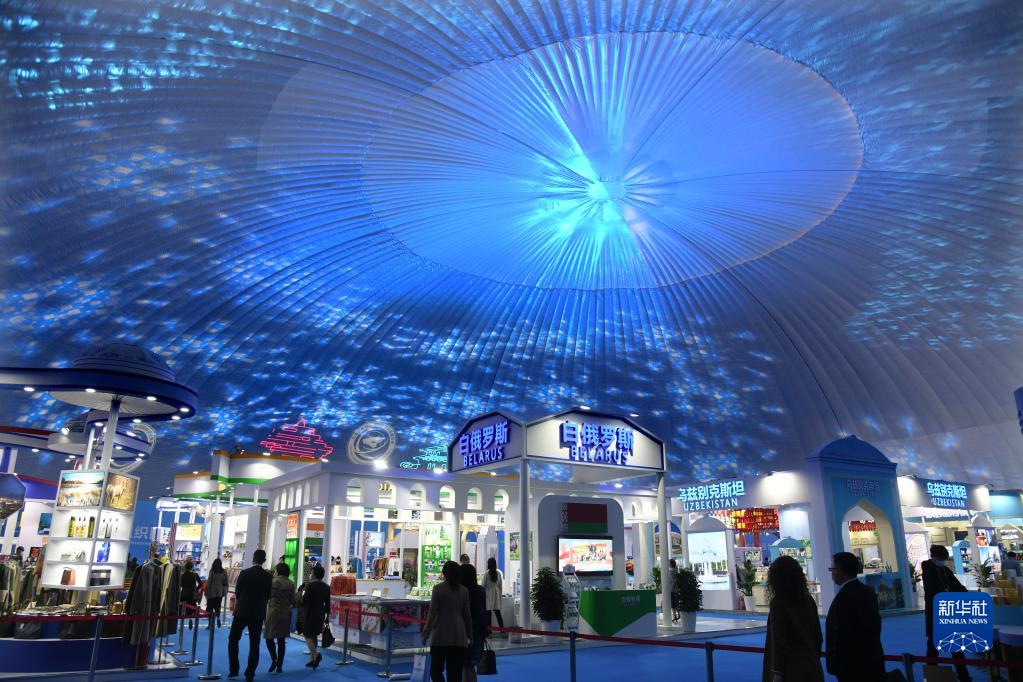 與會(huì)嘉賓在各國(guó)形象館展區(qū)參觀(2021年4月26日攝)。當(dāng)日,2021上海合作組織國(guó)際投資貿(mào)易博覽會(huì)暨上海合作組織地方經(jīng)貿(mào)合作青島論壇在青島開(kāi)幕。新華社記者 李紫恒 攝