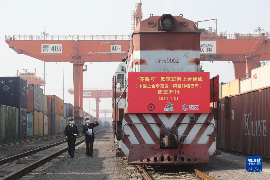 膠州海關(guān)關(guān)員對(duì)“齊魯號(hào)”歐亞班列上合快線(中國(guó)上合示范區(qū)——阿塞拜疆巴庫(kù))線路首班列車進(jìn)行檢查(2021年1月31日攝)。新華社發(fā)(解豪 攝)