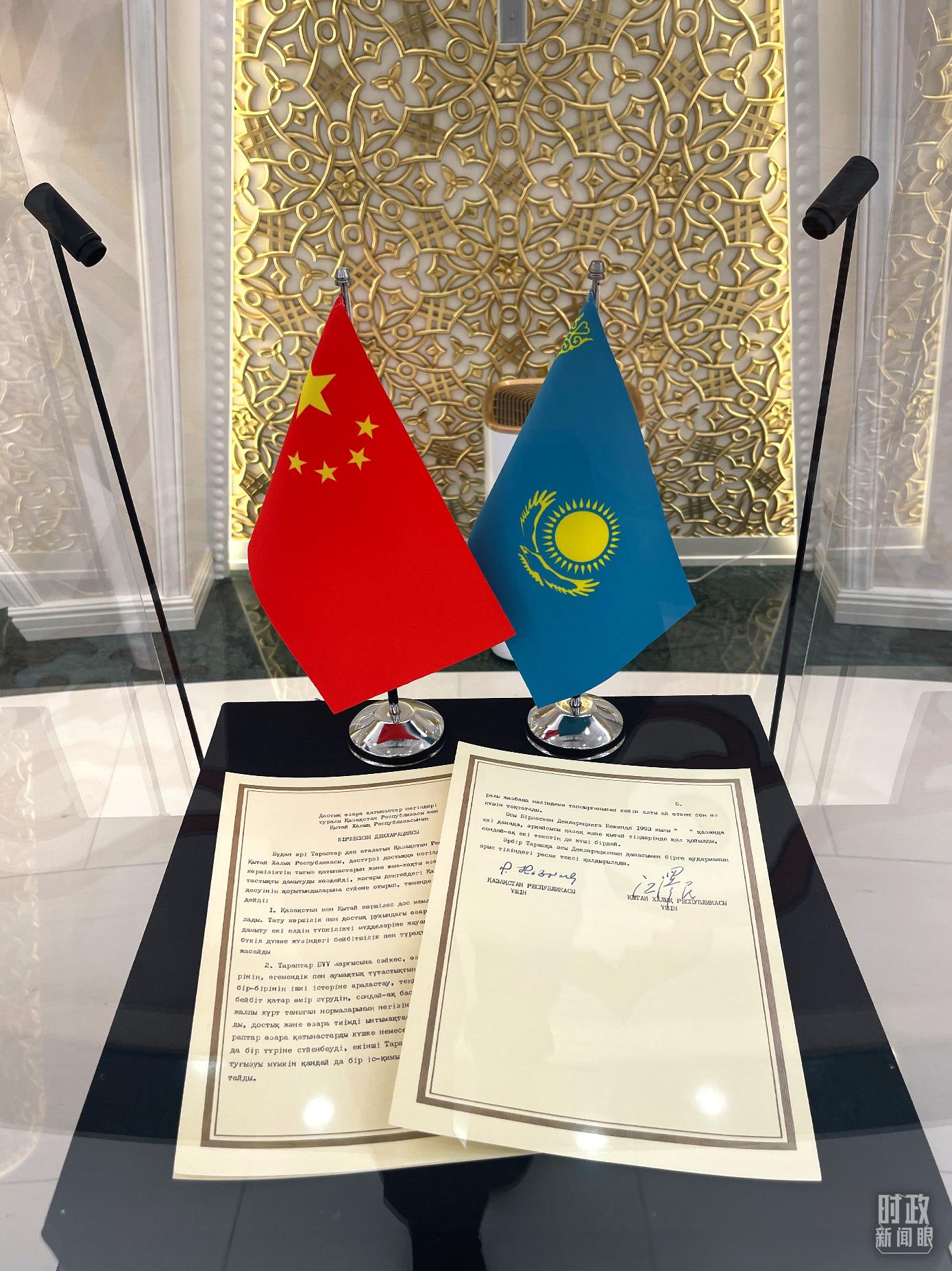 △1993年簽署的《關(guān)于中華人民共和國(guó)和哈薩克斯坦共和國(guó)友好關(guān)系基礎(chǔ)的聯(lián)合聲明》。(總臺(tái)央視記者鄂介甫拍攝)