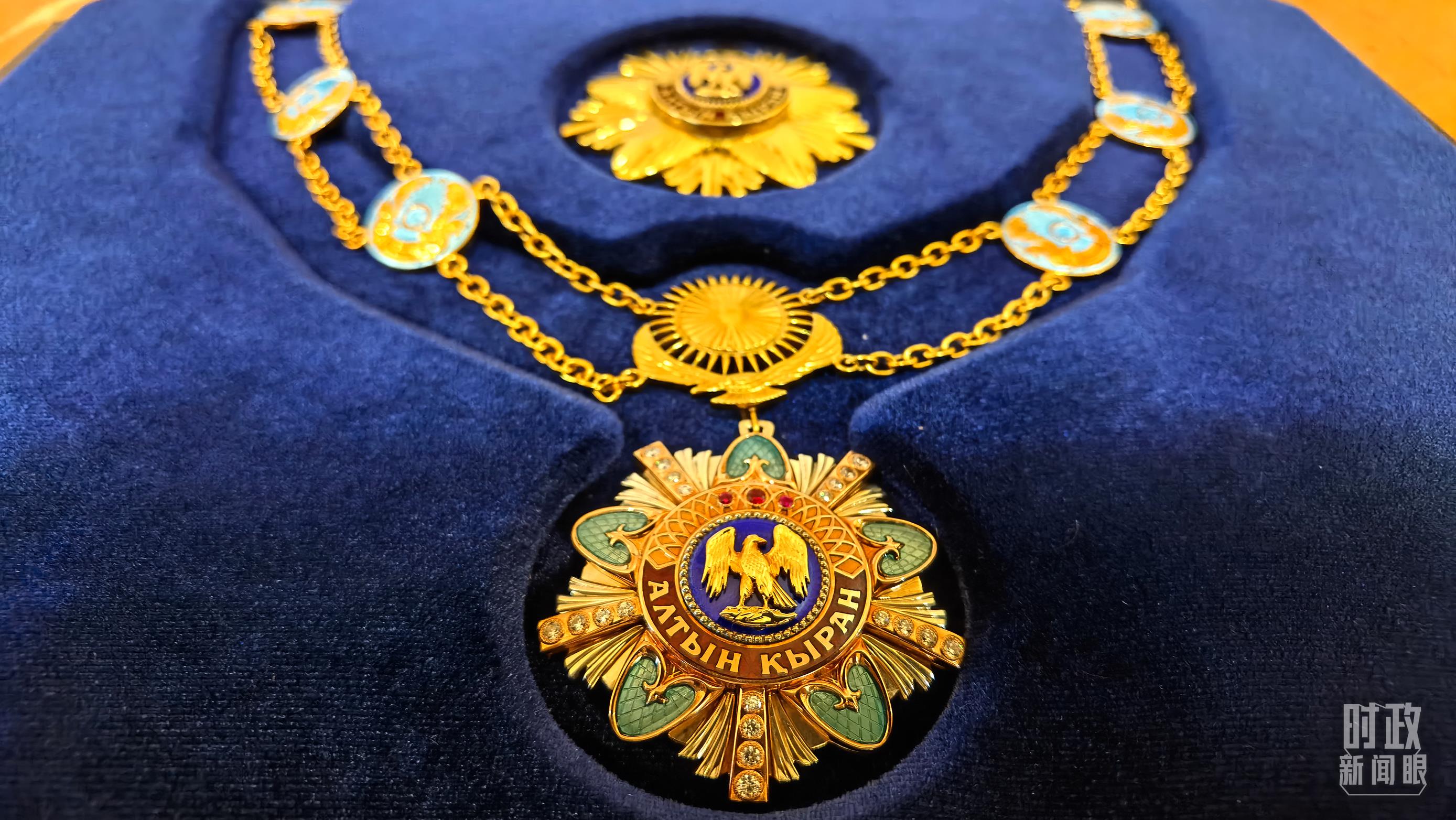 “金鷹”勛章設(shè)立于1995年,是哈薩克斯坦最高榮譽(yù),旨在表彰為哈薩克斯坦國(guó)家建設(shè)和對(duì)外友好關(guān)系作出重大貢獻(xiàn)的人士。“金鷹”勛章一套兩枚,分為領(lǐng)綬和襟綬,兩枚勛章的中央都是一只金色的雄鷹。