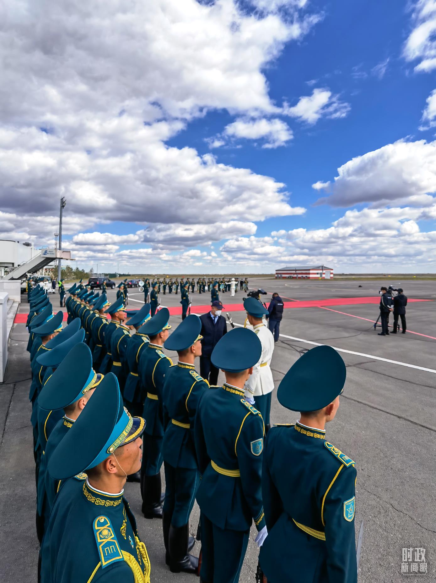 托卡耶夫總統(tǒng)親自前往機(jī)場(chǎng)迎接?,F(xiàn)場(chǎng)70余名禮兵分列兩側(cè)致敬,軍樂團(tuán)奏迎賓號(hào)角。
