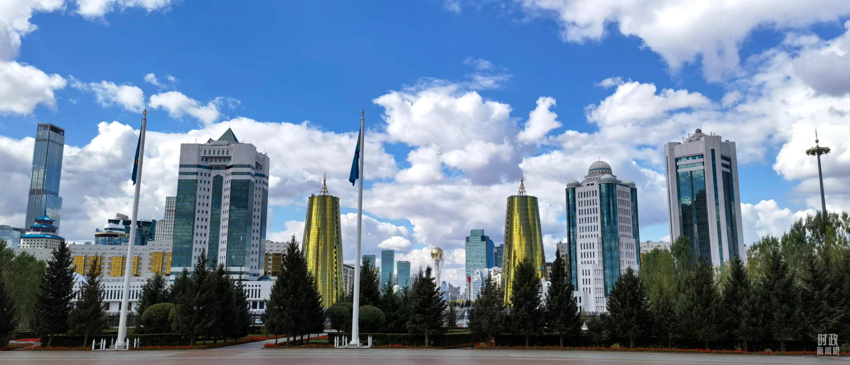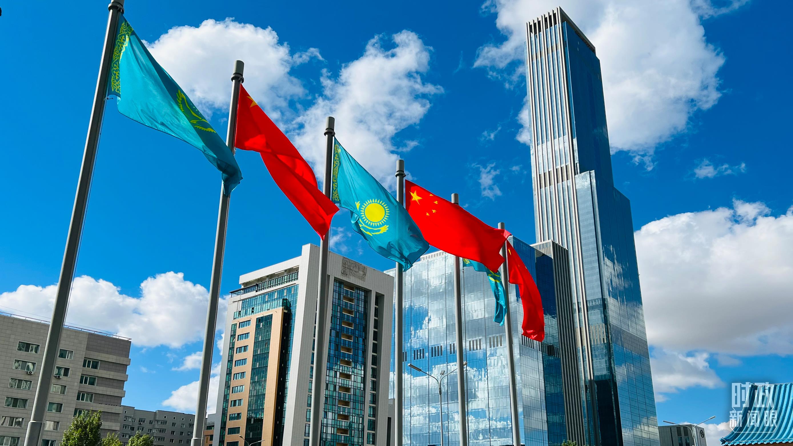 △哈薩克斯坦首都升起中哈兩國(guó)國(guó)旗。(總臺(tái)央視記者魏子鈞拍攝)