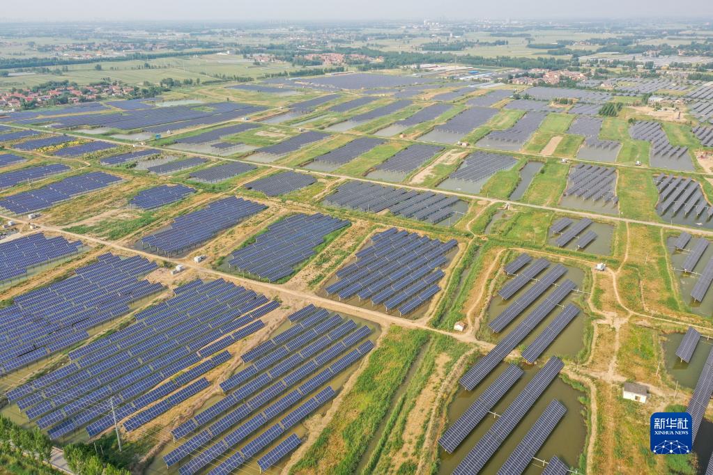 山東高青縣湖東村周邊建設(shè)的千余畝漁光互補(bǔ)養(yǎng)殖場(2022年5月24日攝,無人機(jī)照片)。新華社記者 朱崢 攝