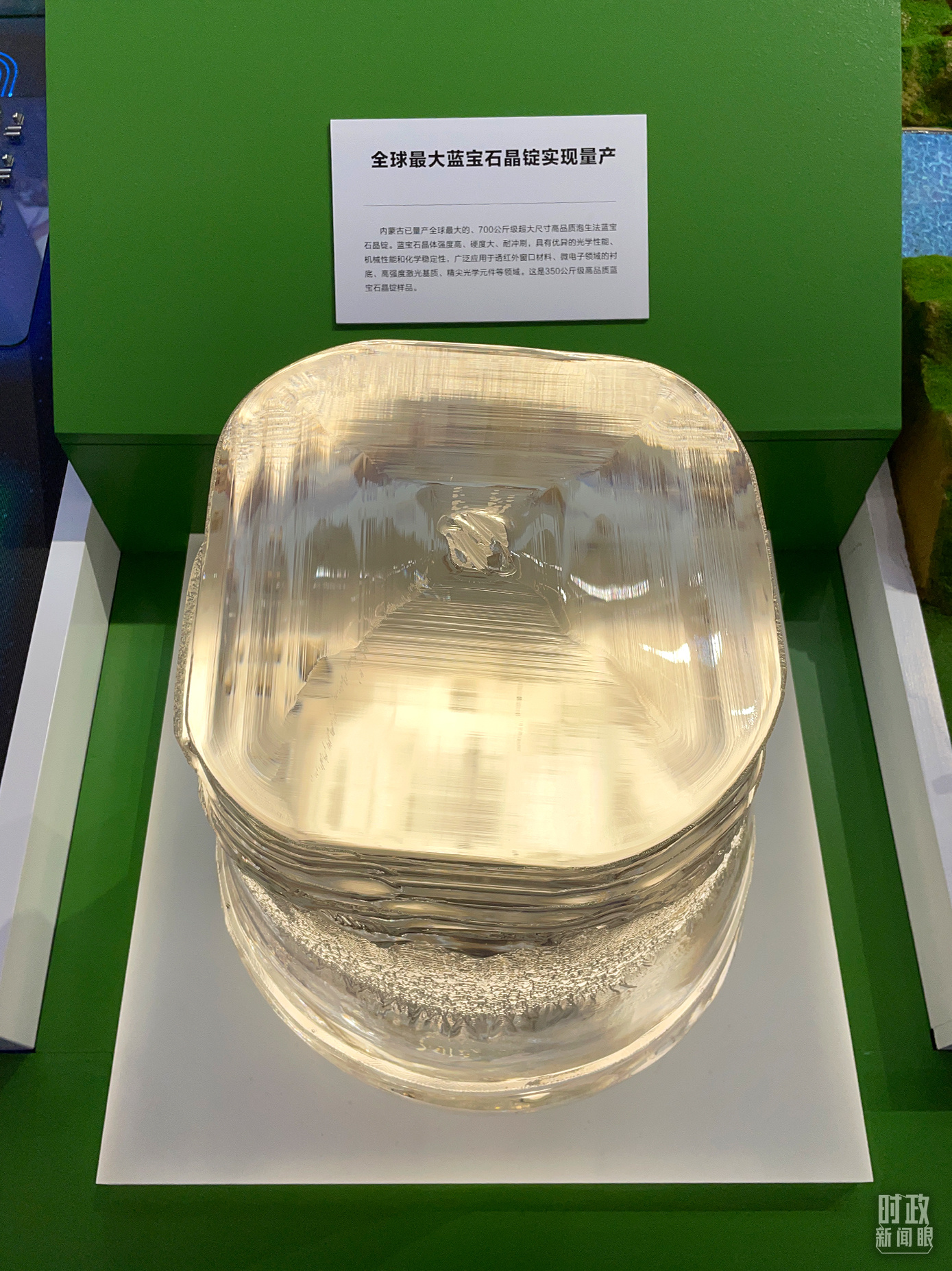 △ 這是350公斤級高品質藍寶石晶錠樣品。藍寶石晶體強度高、硬度大、耐沖刷,應用于精尖光學元件等領域。(總臺央視記者彭漢明拍攝)