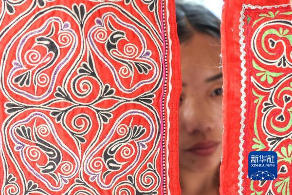 村民在貴州省黔西市新仁苗族鄉(xiāng)化屋村刺繡車間內(nèi)查看苗繡成品(2022年6月1日攝)。新華社記者 歐東衢 攝