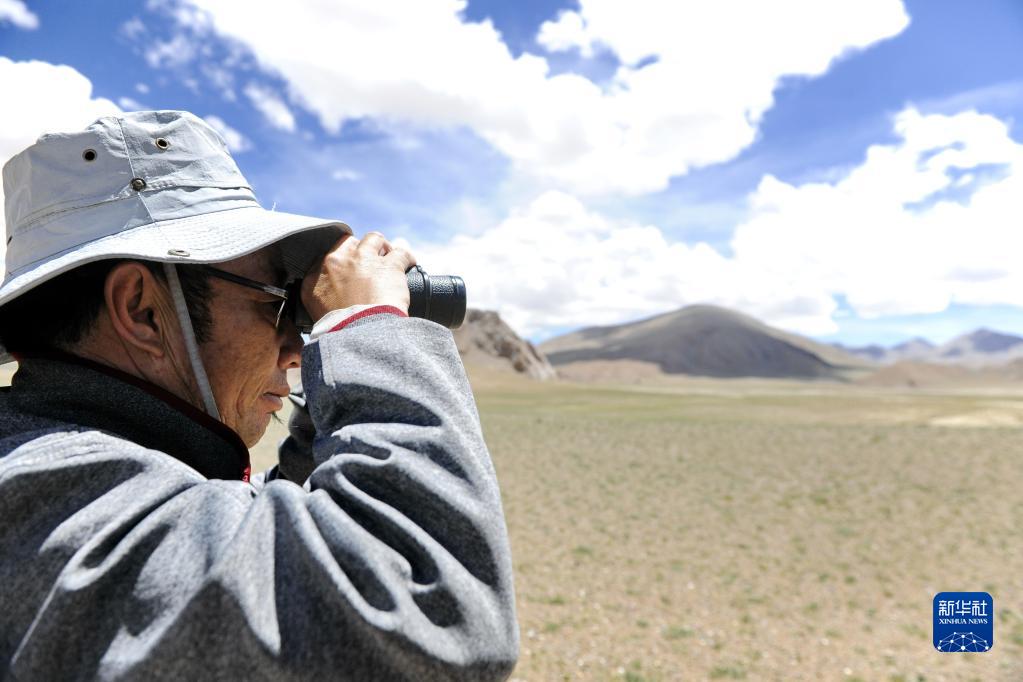 在羌塘國家級自然保護區(qū),野保員用望遠鏡觀察野生動物(2018年8月4日攝)。新華社記者 張汝鋒 攝