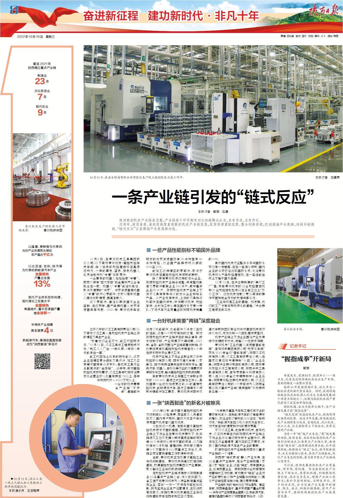 近兩年,陜西省委、省政府高度重視數(shù)控機床產(chǎn)業(yè)鏈發(fā)展,發(fā)揮資源稟賦優(yōu)勢,整合創(chuàng)新資源,打造高端平臺載體,延鏈補鏈強鏈。“鏈式反應(yīng)”正在釋放產(chǎn)業(yè)發(fā)展新動能。
