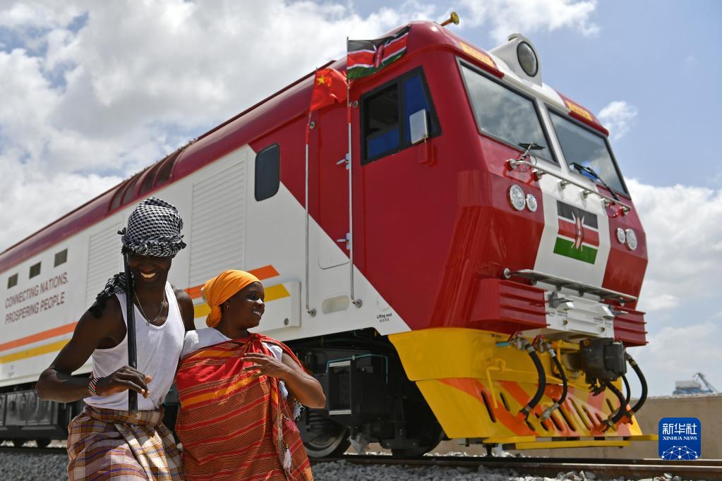在肯尼亞蒙巴薩,當(dāng)?shù)孛癖娫谥袊兄频拿蓛?nèi)鐵路首批內(nèi)燃機(jī)車旁載歌載舞(2017年1月11日攝)。新華社記者 孫瑞博 攝