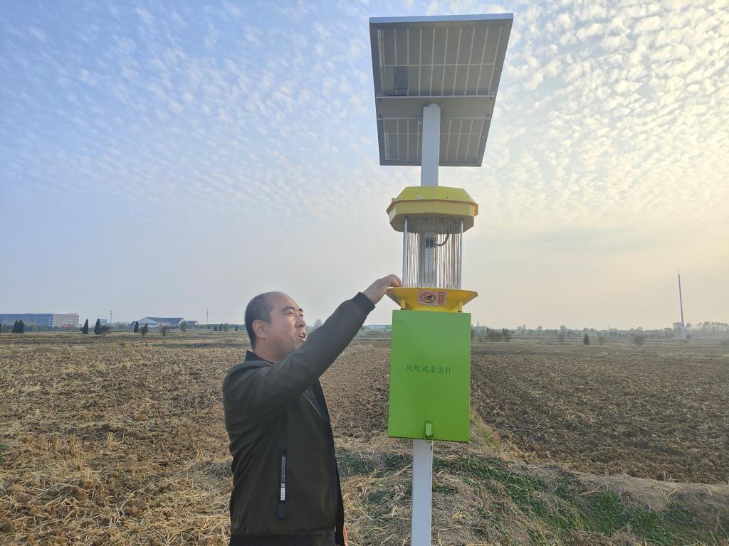 閆大明正在介紹風(fēng)吸式殺蟲(chóng)燈。新華社記者 姜?jiǎng)?攝