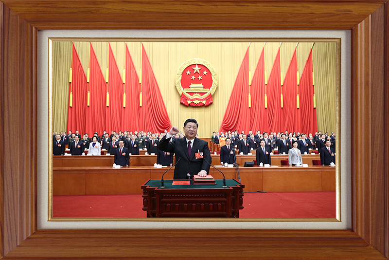 這張照片,是2018年3月17日,習(xí)近平當(dāng)選國家主席、中央軍委主席后進(jìn)行憲法宣誓的場景。自發(fā)表2019年新年賀詞起,就一直擺在書架上。
