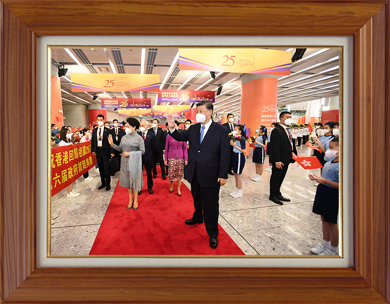 7月1日,香港迎來回歸祖國25周年。6月30日下午,習(xí)近平總書記乘專列抵達(dá)香港,這是習(xí)近平和夫人彭麗媛向歡迎的人群揮手致意。