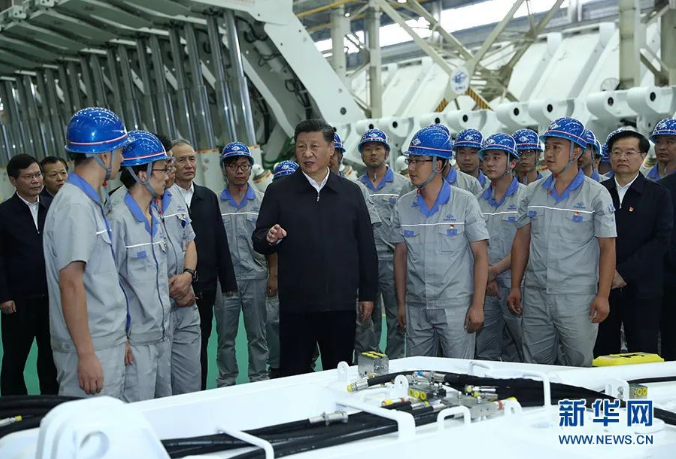 2019年9月16日至18日,習(xí)近平在河南考察。這是17日下午,習(xí)近平在鄭州煤礦機(jī)械集團(tuán)股份有限公司總裝車間同工人們親切交流。新華社記者 鞠鵬 攝
