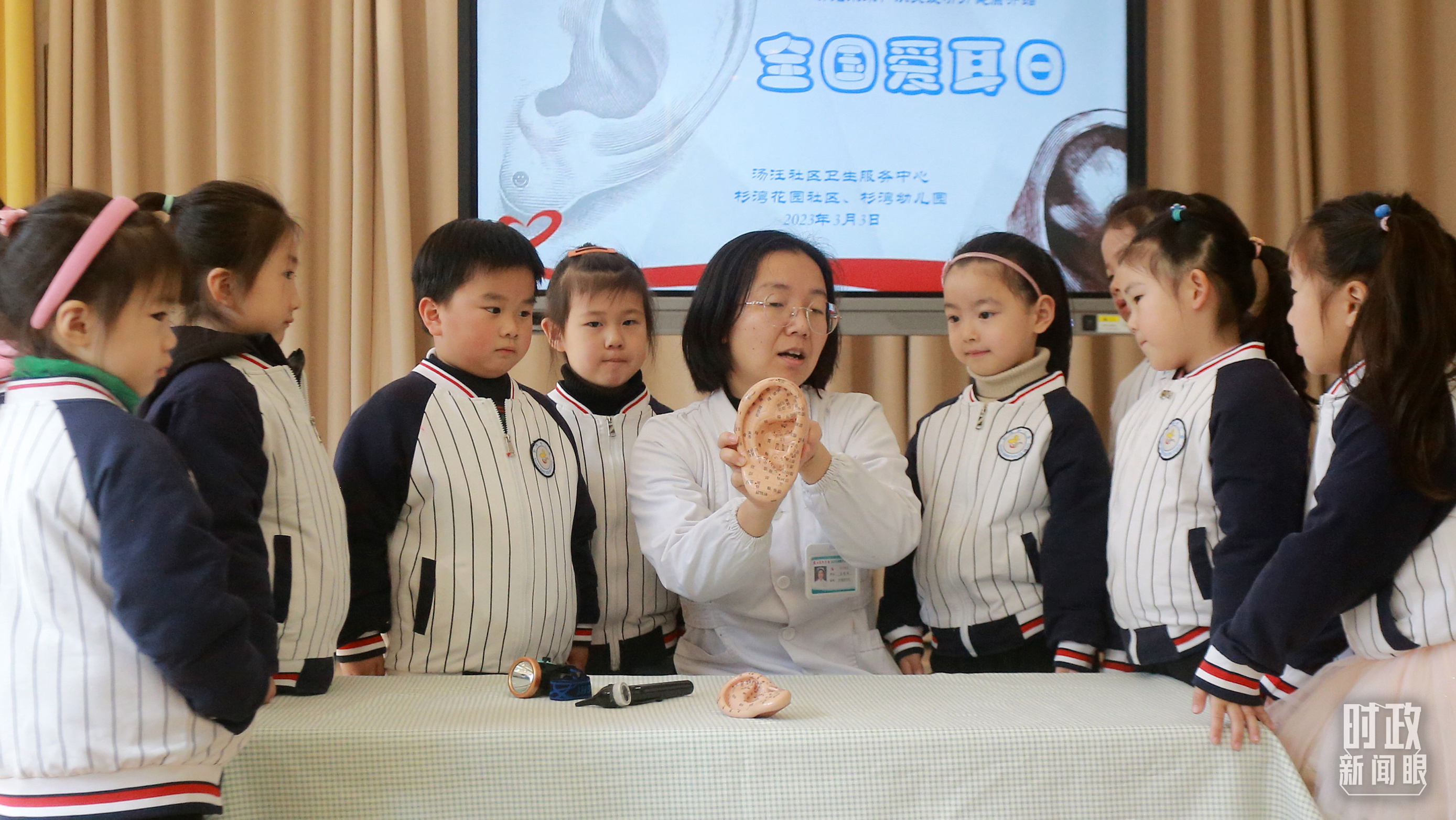 △2023年3月3日,全國(guó)愛(ài)耳日當(dāng)天,江蘇揚(yáng)州一位社區(qū)醫(yī)生正在為小朋友們講解護(hù)耳知識(shí)。(圖/視覺(jué)中國(guó))