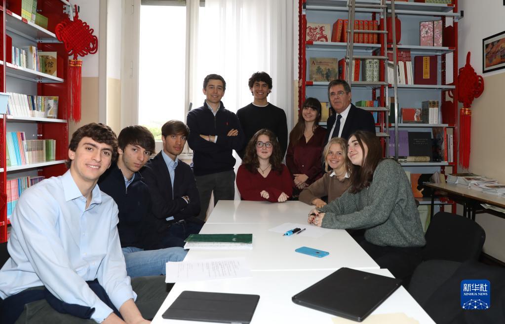 意大利羅馬國(guó)立住讀學(xué)校校長(zhǎng)雷亞萊(后排右一)與致信習(xí)近平主席的學(xué)生們?cè)谝黄穑?019年3月18日攝)。新華社記者 程婷婷 攝