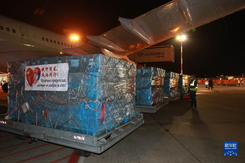 在塞爾維亞首都貝爾格萊德,寫(xiě)有 “鐵桿朋友,風(fēng)雨同行”字樣的中方捐贈(zèng)醫(yī)療物資從飛機(jī)上卸下(2020年3月21日攝)。新華社記者 石中玉 攝