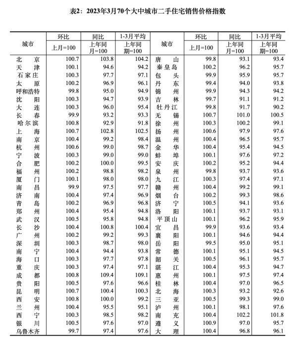 2023年3月70個(gè)大中城市二手住宅銷(xiāo)售價(jià)格指數(shù)。 截圖自國(guó)家統(tǒng)計(jì)局官網(wǎng)