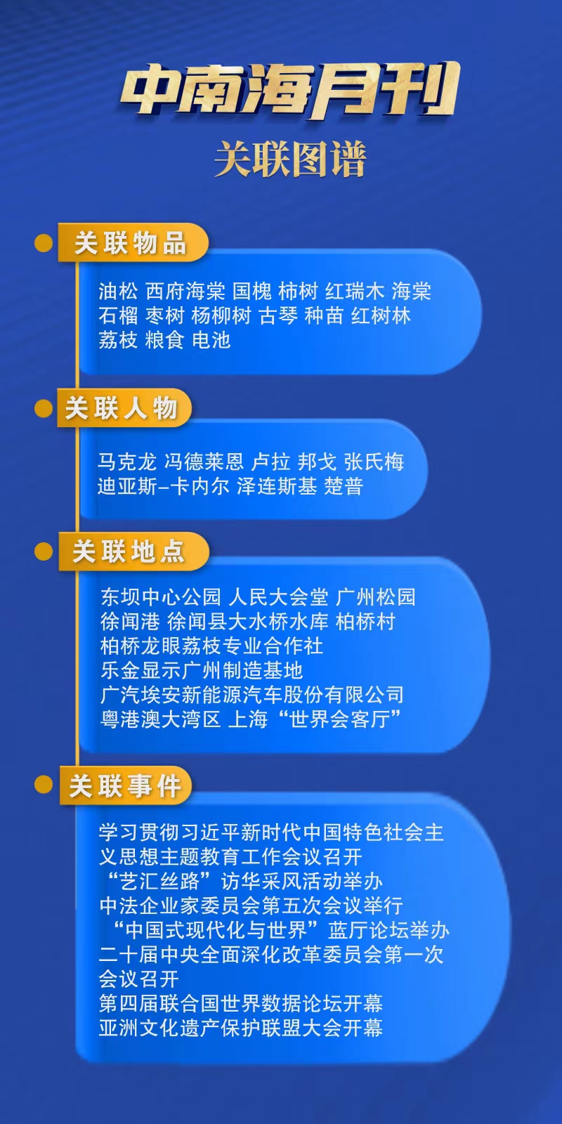 關(guān)聯(lián)地點(diǎn)中的徐聞港、柏橋村等指向總書記的考察地。今年是全面貫徹黨的二十大精神開局之年,習(xí)近平總書記兩會(huì)后首次地方考察選擇了廣東。他對(duì)廣東的干部群眾說:“廣東是一個(gè)窗口。到廣東來看一看,了解一下黨的二十大以來都有哪些新進(jìn)展新氣象。”