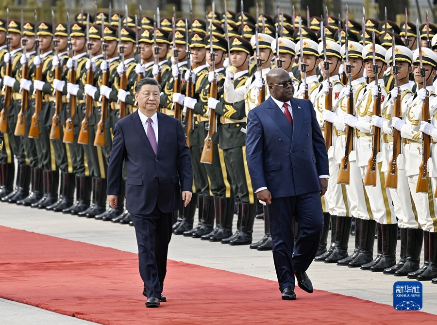 5月26日下午,國家主席習(xí)近平在北京人民大會堂同來華進(jìn)行國事訪問的剛果(金)總統(tǒng)齊塞克迪舉行會談。這是會談前,習(xí)近平在人民大會堂東門外廣場為齊塞克迪舉行歡迎儀式。新華社記者 劉彬 攝
