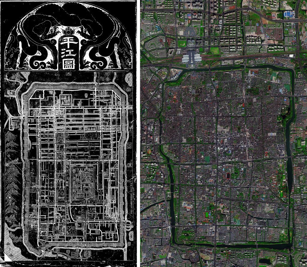 拼版照片:左圖為宋代碑刻《平江圖》(資料照片);右圖為2023年3月拍攝的蘇州古城的衛(wèi)星圖像。