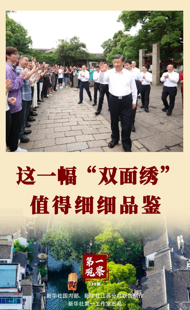 工業(yè)園區(qū)、企業(yè)、歷史文化街區(qū)、科學(xué)實驗室……從蘇州到南京,習(xí)近平總書記在江蘇的考察行程,蘊含著對經(jīng)濟與文化辯證關(guān)系的深邃思考,猶如蘇繡至品“雙面繡”——一面與另一面從不是相互排斥,而是相得益彰、相互成就。