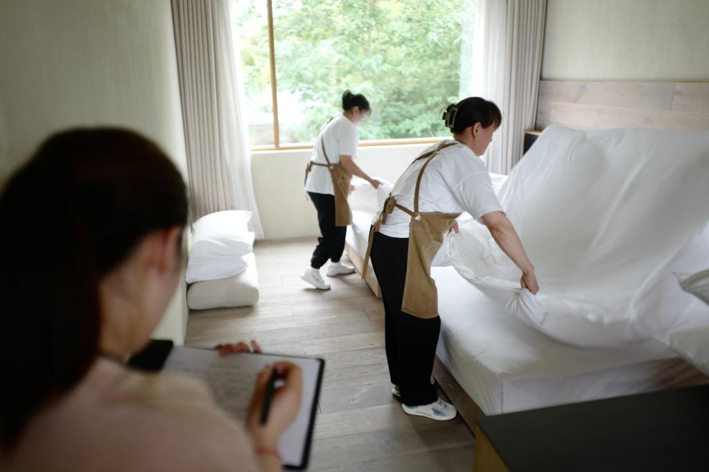 學(xué)員在莫干山民宿管家培訓(xùn)中心內(nèi)進行房務(wù)考核。新華社記者徐中哲 攝