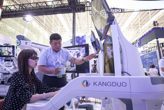 在黑龍江省哈爾濱市舉辦的2022世界5G大會展廳里,參展商現(xiàn)場演示5G遠程手術(shù)機器人(2022年8月10日攝)。新華社記者 張濤 攝