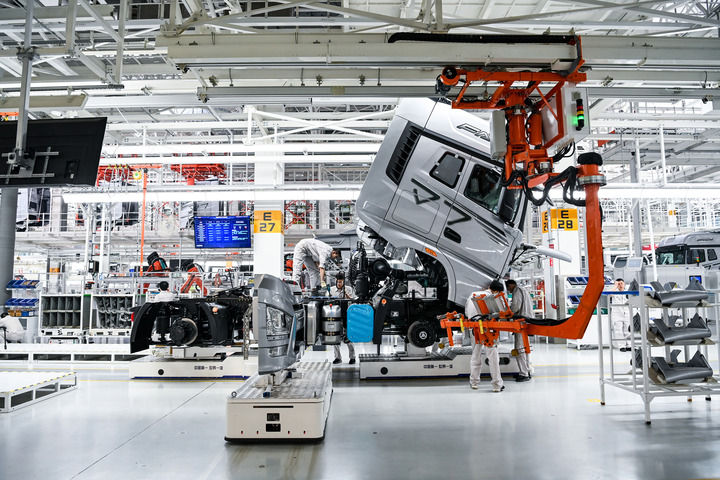 在位于吉林長春的一汽解放汽車有限公司J7智能工廠內(nèi),工人在AGV(搬運機器人)上裝配車輛(2023年6月12日攝)。新華社記者 顏麟蘊 攝