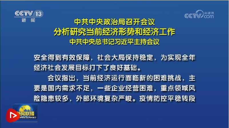 聯(lián)播+ 7月24日,中共中央政治局召開會(huì)議,分析研究當(dāng)前經(jīng)濟(jì)形勢(shì),部署下半年經(jīng)濟(jì)工作。習(xí)近平總書記主持會(huì)議。