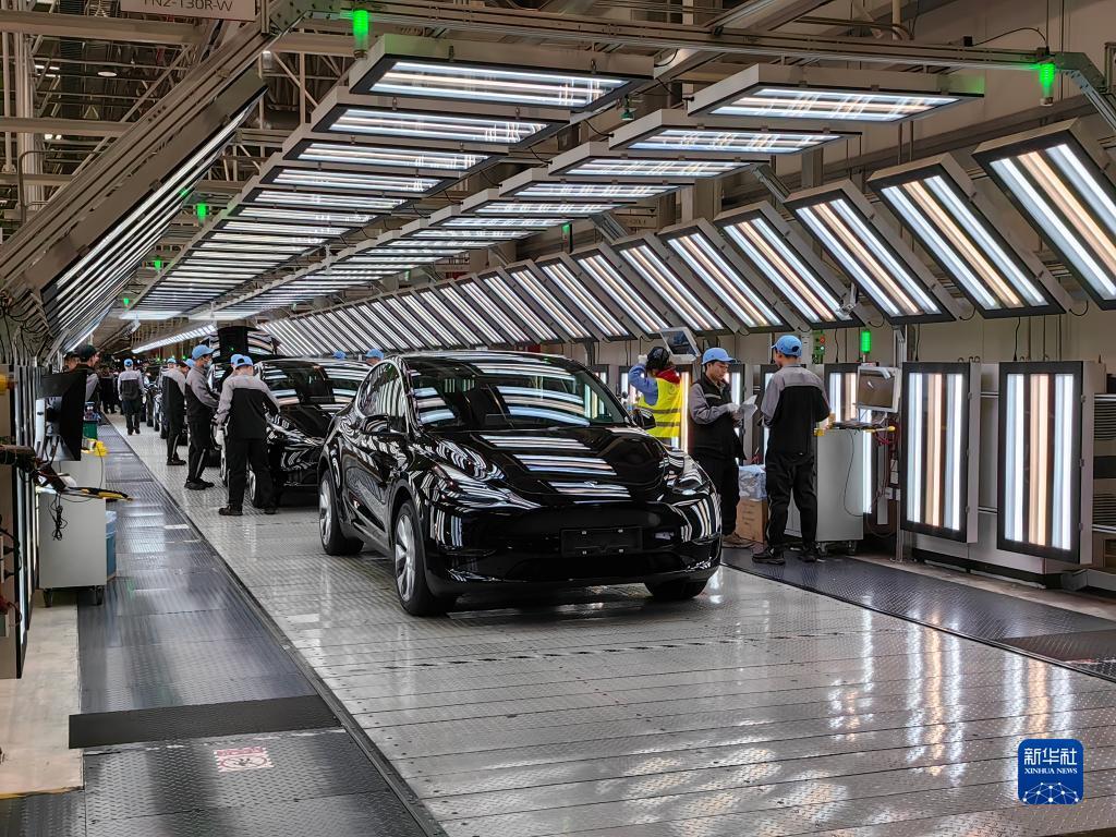 在特斯拉上海超級(jí)工廠,工人在車間內(nèi)忙碌(2月27日攝)。新華社記者 周蕊 攝