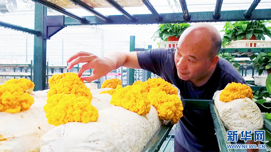 在金米智慧農(nóng)業(yè)產(chǎn)業(yè)園里,技術(shù)負(fù)責(zé)人陳盛林查看金耳長勢(shì)。新華網(wǎng) 楊喜龍 攝