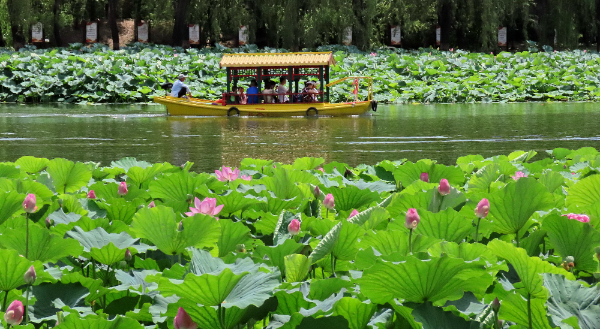 隨著暑假的到來,各地迎來暑期旅游旺季。7月9日,游人在北京市圓明園遺址公園內乘船游玩。新華社記者 李欣 攝