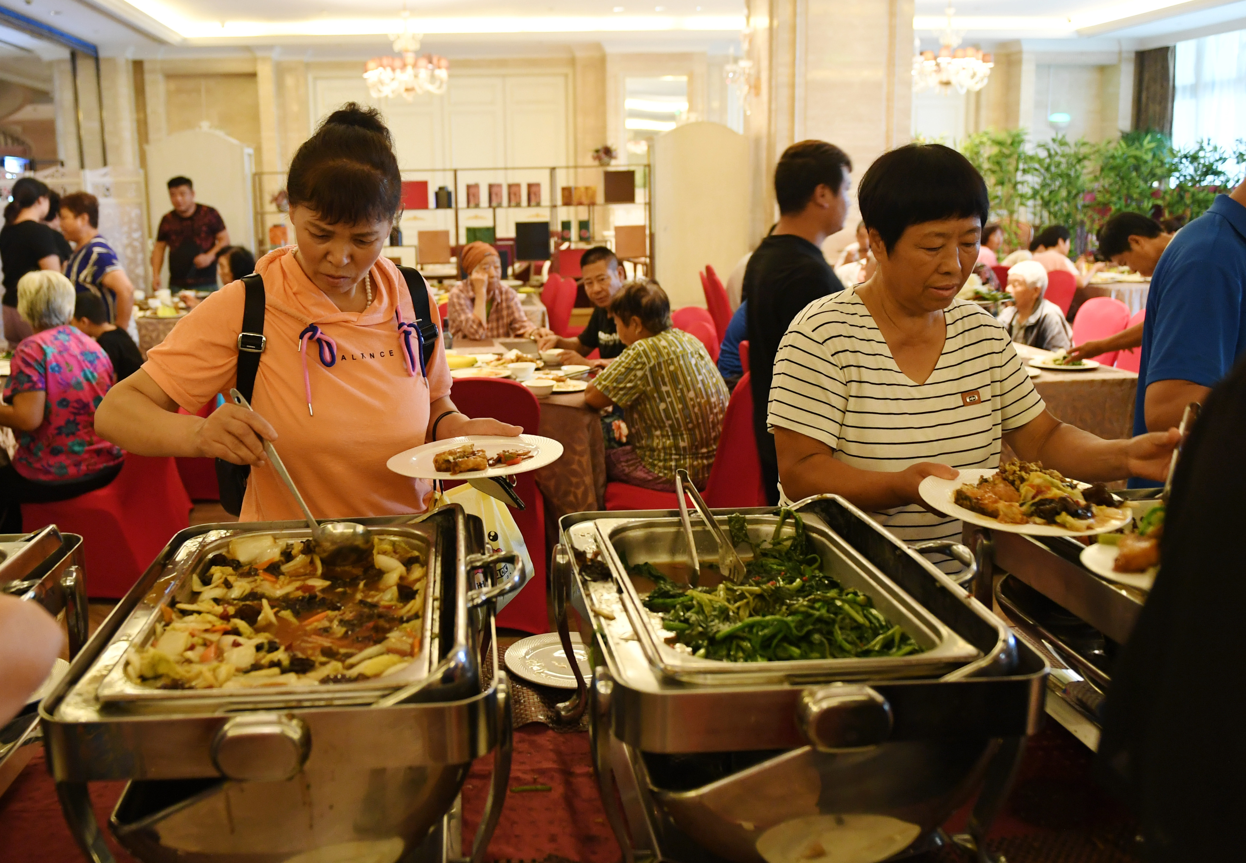 8月1日,北京市房山區(qū)青龍湖鎮(zhèn)的村民在臨時安置點用餐。新華社記者 張晨霖 攝