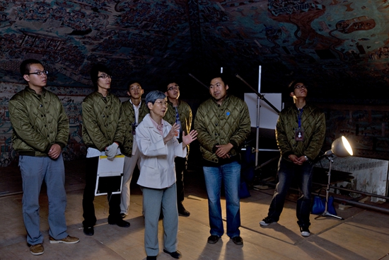 樊錦詩在莫高窟第85窟壁畫修復(fù)現(xiàn)場檢查工作。