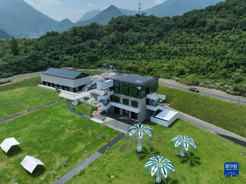 8月11日拍攝的余村未來圖書館,該建筑主要通過鋪設(shè)在屋頂上的光伏發(fā)電系統(tǒng)和“光伏樹”供電(無人機(jī)照片)。