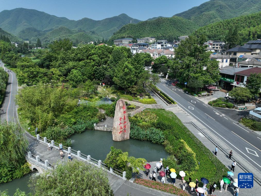 8月11日,游客在安吉余村的綠水青山間參觀(無人機(jī)照片)。