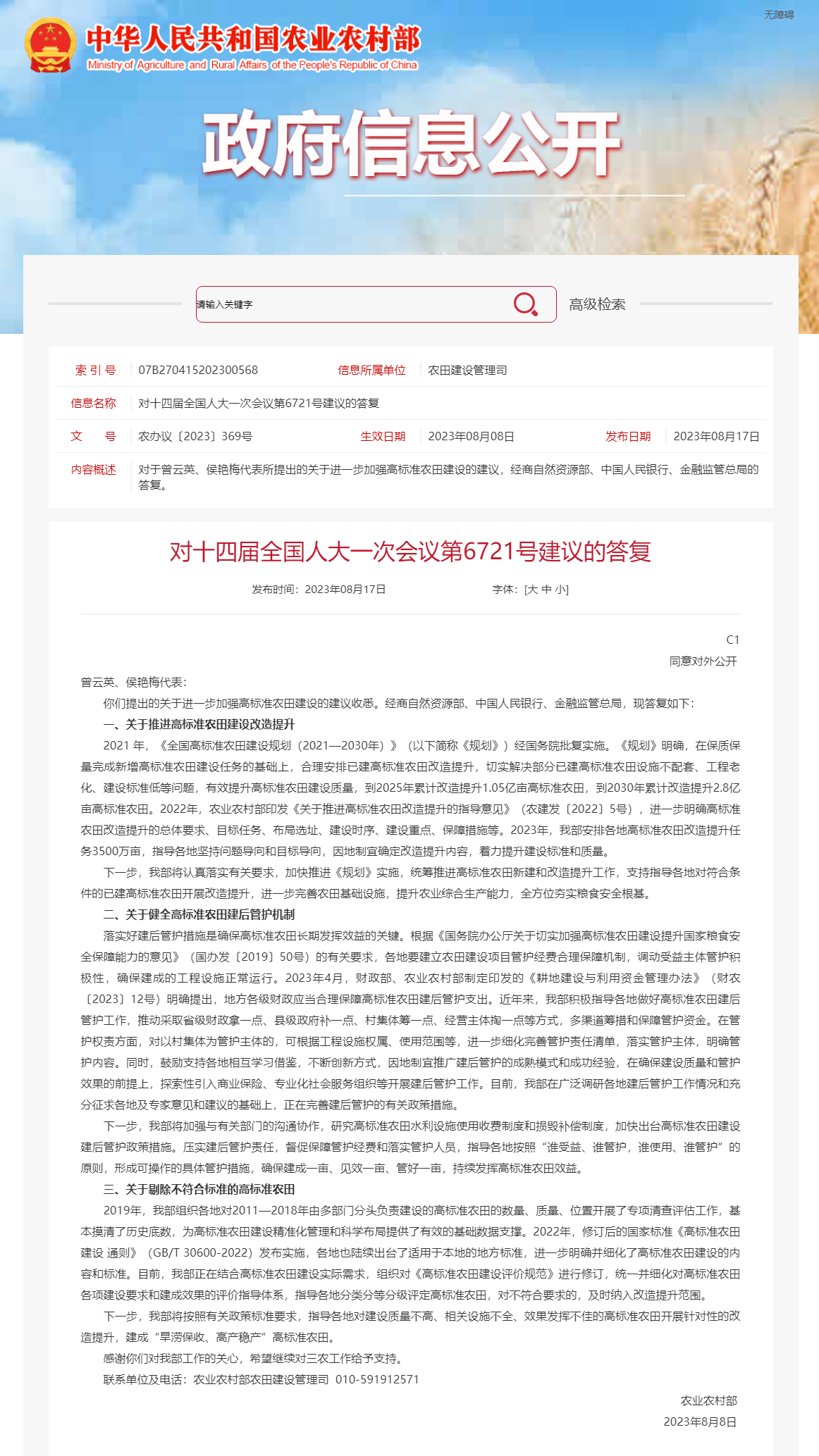 央視網(wǎng)消息:8月17日,農(nóng)業(yè)農(nóng)村部公布對十四屆全國人大一次會議第6721號建議的答復(fù)。其中提出,下一步,農(nóng)業(yè)農(nóng)村部將加強與有關(guān)部門的溝通協(xié)作,研究高標(biāo)準(zhǔn)農(nóng)田水利設(shè)施使用收費制度和損毀補償制度,加快出臺高標(biāo)準(zhǔn)農(nóng)田建設(shè)建后管護政策措施。壓實建后管護責(zé)任,督促保障管護經(jīng)費和落實管護人員,指導(dǎo)各地按照“誰受益、誰管護,誰使用、誰管護”的原則,形成可操作的具體管護措施,確保建成一畝、見效一畝、管好一畝,持續(xù)發(fā)揮高標(biāo)準(zhǔn)農(nóng)田效益。